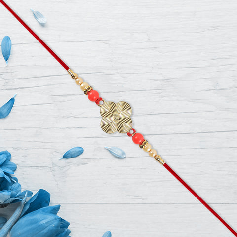 Rakhi With Multicolor Beads Silver Accents On Red Thread